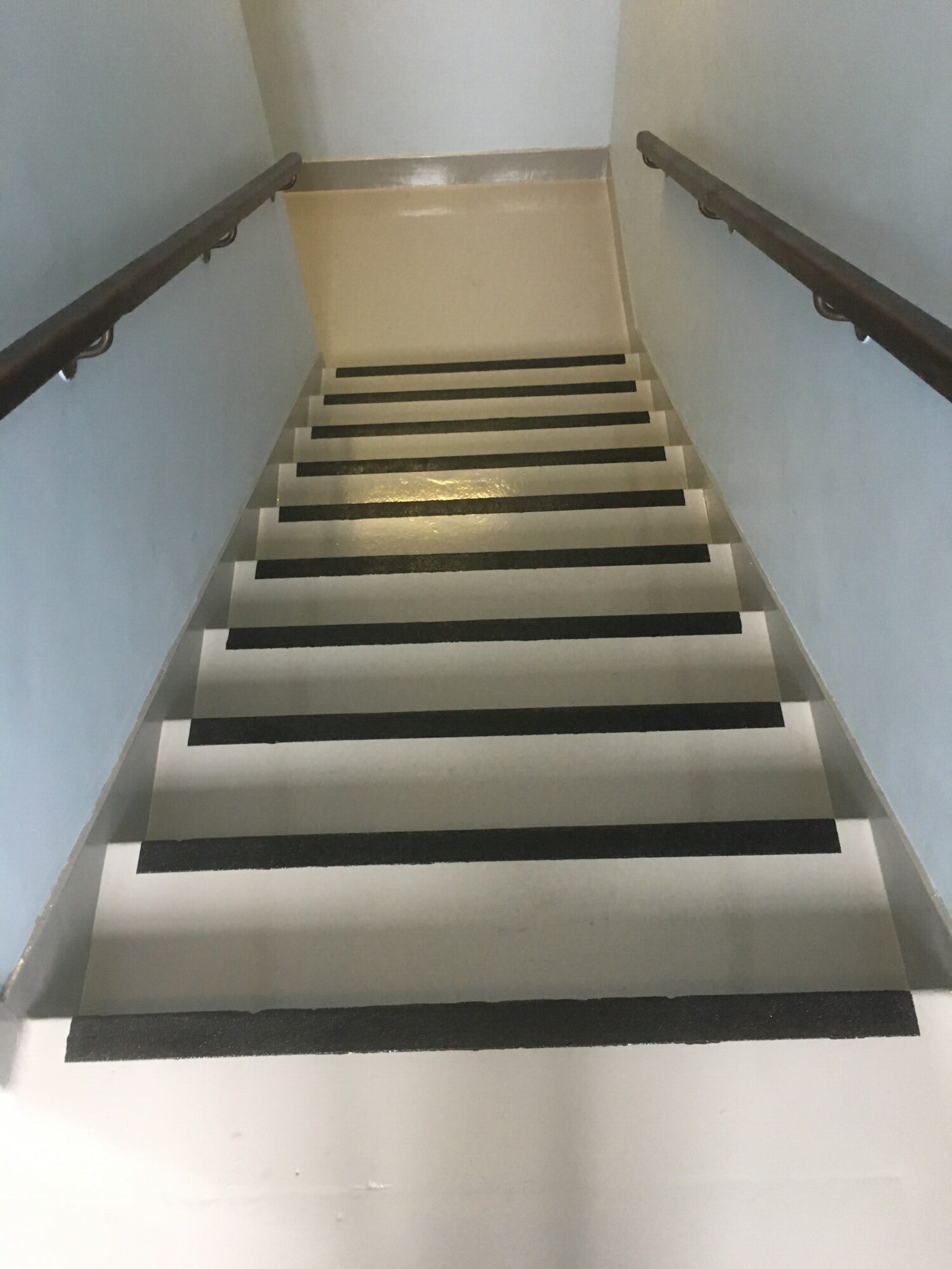The client was worried the stairs were becoming a slip hazard and looking tired so we prepared the stairs with a vacuum assisted diamond grinder and coated the stairs with epoxy high build coating then applied a non slip nosing using epoxy high build coating and coarse non slip aggregates.